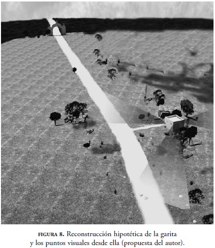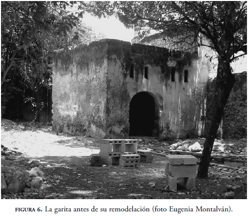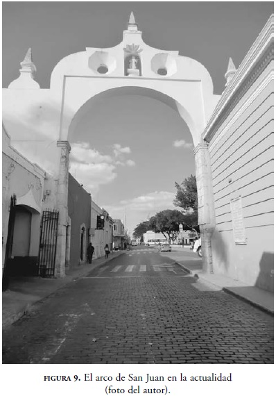 Cabe recordar que Tello opina que el siglo XVII fue una centuria de consolidación, equipamiento e infraestructura para Mérida, y que entre esas medidas se encontraba el hacer de ella una ciudad murada, lo que derivó únicamente "en la construcción de diferentes puertas o arcos".55 En ese sentido, la garita pudo estar ligada al proyecto de los arcos, en específico al dedicado a San Cristóbal56 más conocido como de San Juan, levantado hacia el norte de la misma, a una distancia aproximada de 230 m (Ilus. 8). El celo establecido y los temores ante el peligro hicieron que la entrada a la ciudad estuviese protegida de alguna manera, pero tampoco hay que olvidar el afán por controlar el tráfico de mercancías ilegales y la seguridad pública del camino, aunque la primera idea nos parece más atractiva.57 (Ilus. 9)