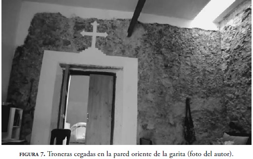 Esta construcción, que mide 5.40 m de ancho en su frente original por 5.60 m de fondo (muro donde está actualmente la entrada), se alza a 4.17 m y exhibe muros de 48 cm de grosor, ha sufrido modificaciones con el paso del tiempo pero aún mantiene rasgos que nos ayudan a sustentar nuestra idea (Ilus. 6). Cabe decir que la actual entrada, ubicada al suroeste, no es la original. Ésta estuvo en la pared noreste y debió cerrarse para lograr mayor accesibilidad cuando se reutilizó el espacio.44 Las cuatro troneras existentes en la pared suroeste tienen una vista desviada hacia la derecha; en la pared contigua, que según se nota fue reconstruida, no hay evidencia actual de troneras, pero con seguridad las tuvo, con una vista desviada igualmente a su derecha. Esos dos grupos de troneras, a una altura a 2.62 m, posibilitaban mayor y mejor amplitud de cobertura visual de la curva de entrada con dirección al arco de San Juan, labor para la que se requerían, cuando menos, dos personas. Dichas troneras medían 52 cm de alto por 20 de ancho. Por la pared del noroeste hay tres troneras cegadas, a 1.96 m de altura de altura, por medio de las cuales se celaba ese rumbo (Ilus. 7). La medida de las troneras de este costado varía con respecto a las otras ya que miden 64 cm de alto por 27 de ancho. A un costado existe una puerta que también debió abrirse con posterioridad, aunque no hay rasgos de otras troneras por ese lado.