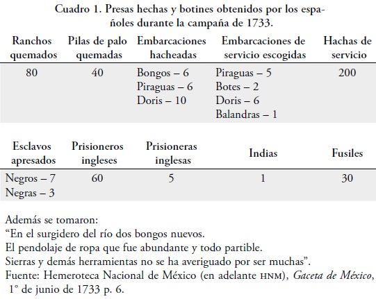 La empresa que produjo mayores logros fue la realizada en 1733, cuando don Antonio Figueroa montó una expedición compuesta por más de 250 soldados, que entraron en combate contra los británicos el 29 de marzo. Según la relación que apareció en la Gaceta de México, el 1° de junio de 1733, la fuerza española tomó una balandra en la entrada al río Walix "que venía a cargar Palo [de tinte], en que se hallaron dos barriles de harina, dos de carne de puerco, 32 de carne de vaca, cuatro pipas de pan y seis barriles de aguardiente romo".54 El autor del relato menciona que el comandante de la expedición inició la construcción de un fuerte en la punta Sur del río, compuesto de estacada, fajina y terraplén, donde colocó siete cañones sobre explanadas de tablones y vigas de cedro, y añade que "dos navíos de los tres que fueron apresados (una balandra de guerra y otra de transporte) se enviaron a Campeche, quedando de resguardo en dicho surgidero una galera y otro navío, armados en artillería correspondiente y defendidas por los cañones del fuerte".55