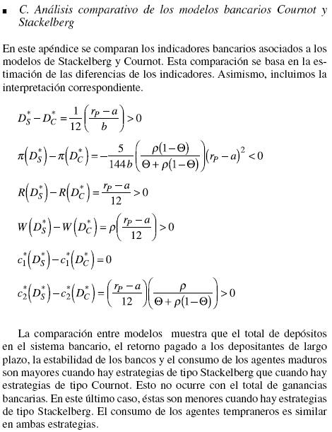 19 Estas desigualdades se estiman usando las diferencias entre los indicadores de desempeño bancario de los modelos tipo Cournot y Stackelberg [véase el apéndice C]. Adviértase que no hemos incluido una desigualdad para comparar el consumo de los agentes tempraneros. Esto ocurre debido a que, en ambos modelos, el consumo de éstos es idéntico.