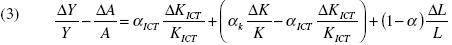 In the above expression, the symbol Δ represents the increment of the variable in question, and α is the share of physical capital divided into two parts, one relative to ICT capital (αICT), and the other relative to the rest of physical capital (αICT).9 We will use equation (3) to perform our growth accounting exercise.