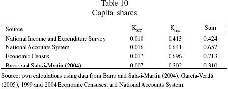 To split the share of physical capital between ICT capital and nonICT capital, the literature generally uses a method created by the BLS (Sichel, 1999). However, we do not have the necessary information to apply such method. Instead, we use the share of ICT capital with respect to total capital between 1999 and 2004. According to the Economic Censuses, the former represents 2.43 percent of the latter. The data are presented below.