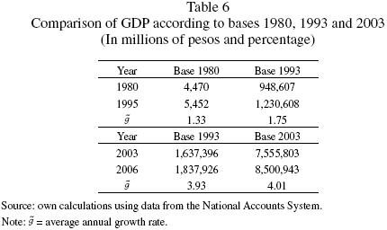 According to the 1980 base, between 1980 and 1995, the economy grew at an average annual rate of 1.3 percent. However, according to the 1993 base, this figure was 1.75 percent, which represents a substantial difference between both estimates (0.42 percent). But, when using the 1993 and 2003 structures to estimate the annual average growth rate of GDP between 2003 and 2006, the difference is just 0.08 percent. We argue that this problem is caused by the incomplete quality adjustment taken by INEGI in the valuation of the macroeconomic variables at constant prices, and is worsened especially in the case of ICT goods and services.