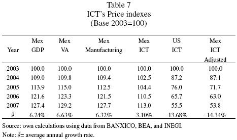 We can observe that the changes in the price indexes of GDP, value added and manufacturing were almost identical between 2003 and 2007. But they were quite different from the ICT sector. If we review the US and the Mexican indexes adjusted from the US ICT sector prices, we obtain evidence similar to that reported by Wyckoff (1995). It is necessary to clarify that, to obtain the adjusted ICT index, we employed the third procedure suggested by Schreyer (2001).8