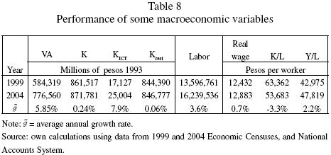 The Economic Censuses of 1999 and 2004 give us the information about the value added, ICT capital and the rest of physical capital, number of workers, and other relevant variables, such as wages. Table 8 presents the levels of these variables in real terms and their corresponding average annual growth rates (