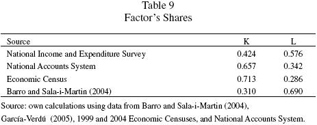 The information presented in table 9 suggests quite different realities. GarcíaVerdú (2005) argues that the US and Mexico's factors' share are relatively similar. However, the estimates based on the National Accounts System reveals a different Mexico. Moreover, according to the Economic Census, the "slices of the pie" were cut precisely the opposite way. We consider the latter is true because, among other reasons, National Accounts covers only the formal part of the Mexican economy.13
