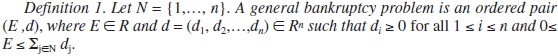 We suppose a problem with n creditors and we interpret di as the amount that the ith creditor demands, whereas E is the total amount that may be repaid.