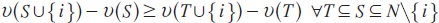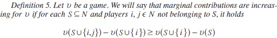 Thus, the game v is convex if and only if the marginal contribution of a player to a coalition is monotone nondecreasing with respect to set-theoretic inclusion. This explains the term convex.