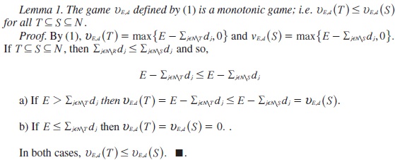 Proof. First, we suppose 0 ≤ xi ≤ di, ∀i ∈ N . For every coalition S, such that, Φ ‡ S ⊆ N we have x(S) ≤ x(N)= E. On the other hand, x(S) ≤