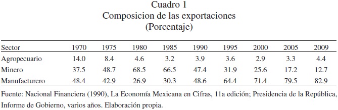 Con tan diferentes ritmos de expansión de las varias clases de bienes exportados, se transformó la composición de exportaciones. Las exportaciones mineras (básicamente petróleo crudo) que en 1981 representaban el 74.1% del total de exportaciones, para el año 2003 se habían reducido al 25.5%. En contraste, las exportaciones del sector manufacturero pasaron del 26.9% del total en 1980 a casi el 83 % en el año 2009, véase Cuadro 1.
