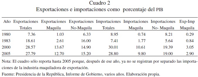 Este rápido crecimiento del comercio queda mostrado en el avance de las exportaciones y las importaciones como porcentaje del PIB nacional, las que indican también el grado de apertura de la economía nacional. Por su avance en el mercado estadounidense, el proceso de liberación comercial mexicano solía ser catalogado como de milagro exportador. No obstante, estos resultados son menos espectaculares de lo que generalmente se cree. Decimos esto porque las exportaciones netas (exportaciones menos importaciones de insumos necesarias para producirlas) son mucho menores que las exportaciones brutas; el impacto de las exportaciones manufactureras sobre el PIB mexicano es reducido debido a la gran demanda de importaciones que éstas generan. Las exportaciones brutas mexicanas no reflejan su verdadero peso en la demanda agregada nacional. Esto es particularmente agudo en el caso de las exportaciones realizadas bajo el régimen de la maquila y de los otros programas de importación temporal para las exportaciones. Así, por ejemplo, en 2005, las exportaciones brutas de maquila representaron el 12.7% del PIB, una cifra importante, es cierto; sin embargo, al sustraer de las exportaciones brutas el valor de las importaciones de partes y componentes, las exportaciones netas de maquila (exportaciones brutas menos las importaciones necesarias para producirlas), ese 12.7 % se reduce a un mero 2.9% del PIB, es decir, cuatro y media veces menos. Esto es, la actividad maquiladora aporta menos del 3.0% al valor agregado nacional. Véase Cuadro II.2. Con las exportaciones netas, más realistas que las de las exportaciones totales de bienes ensamblados, es fácil entender el bajo impacto de las exportaciones y de la actividad maquiladora sobre el resto de la economía.