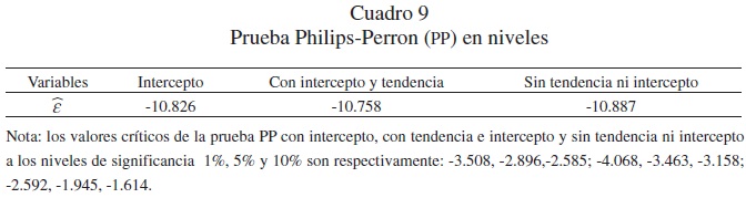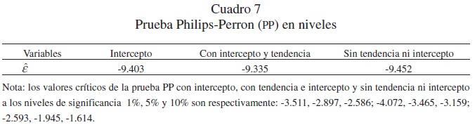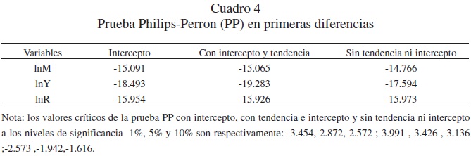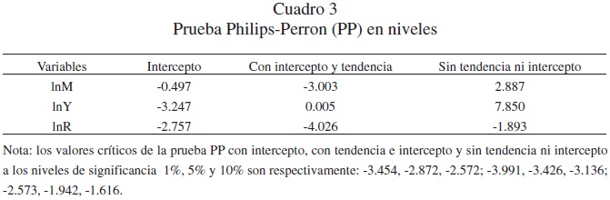 Los resultados de las pruebas de raíces unitarias usando la Prueba Philips-Perron para las tres series trimestrales durante el período 1940q1-2009q4 indican que las variables tienen el mismo nivel de integración, todas son En los cuadros 3 y 4 aparecen los resultados de las pruebas Phillips-Perron (PP).