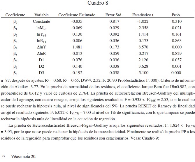 Se estimó la regresión y pasó la prueba de no autocorrelación de grado 2, 3 y 4, así como las pruebas de linealidad, normalidad y homocedasticidad. Los resultados aparecen en el Cuadro 8.