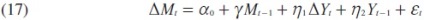 Donde γ = (α1 - 1), η1 = β0 λ1, y η2 = β1 + β0. Este modelo puede ser reescrito en la forma de corrección de errores de la forma siguiente: