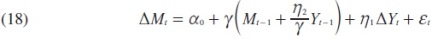 Esta ecuación representa los valores para los cuales M y Y están en equilibrio de largo plazo y k¡ representa el multiplicador de largo plazo de Y sobre M. Cualquier desviación del equilibrio M* - (k0 + ki Y*) ‡ 0 debe inducir cambios de retroalimentación al equilibrio en el siguiente periodo. Sin embargo, no podemos estimar directamente la tasa a la que regresa al equilibrio en el modelo ADL, dado que Mt no es estacionaria. Como tal, los analistas pocas veces sacan inferencias de los modelos ADL directamente acerca de la tasa de corrección de errores implícita en el modelo.