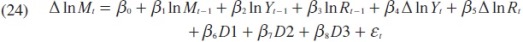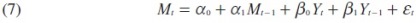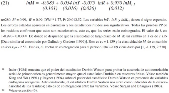 Dado que el modelo ADL(1,1) tiene una variable dependiente rezagada en el lado derecho, ésta puede ser estimada en forma consistente por mínimos cuadrados ordinarios (OLS)11 y tiene una condición de estacionariedad, según la cual Mt debe de ser estacionaria (Davison y MacKinnon 1993).