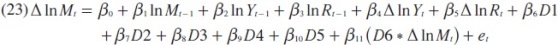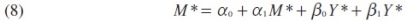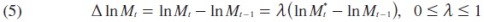 Donde ln M* es el logaritmo de la cantidad deseada de demanda de importaciones en el tiempo t y λ es el coeficiente de ajuste. Al sustituir la ecuación (4) en (5), la ecuación dinámica de importaciones se convierte en: