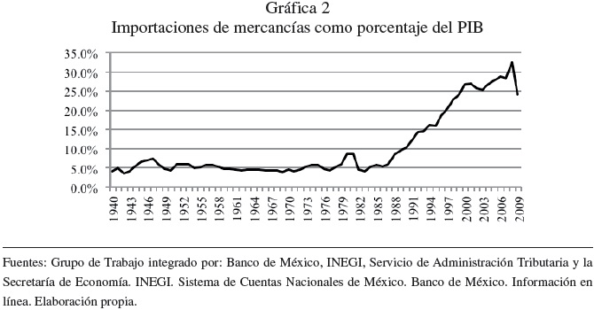 Por su parte las importaciones de mercancías también registraron un crecimiento espectacular. Éstas pasaron de representar alrededor del 5% del PIB en promedio, de 1950 a 1980, para luego elevarse hasta alcanzar más del 30% del PIB en 2008. Véase Gráfica 2.