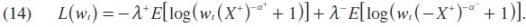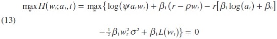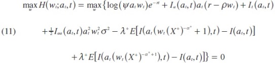 The Hamilton-Jacobi-Bellman equation for the stochastic optimal control problem of maximizing utility, with log(ct) = log(Ψatwt), and assuming that Y+ and Y- are stochastically independent of dNt+ and dNt-, respectively, is given by (see, for instance, Venegas-Martínez, 2008).