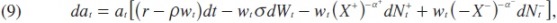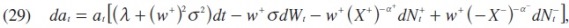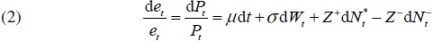 where the trend µ ∈ ℜ (a real number) is the expected (annualized) mean of the exchange rate, σ> 0 is the instantaneous (annualized) volatility of the exchange rate, (Wt)t>0 is a Brownian motion defined on a fixed probability space (Ω, F, (FWt)t∈[0,T], PW) to model small movements in the exchange rate, and dNt+ and dNt- are both Poisson processes with intensity parameters λ+ and λ- representing the number of upward and downward jumps, respectively, of the exchange rate per unit of time. We will assume that λ+ > λ-. The size of the upward and downward jumps satisfy, respectively,