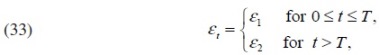 where T is exogenously determined, and ε1 < ε2, as in Calvo (1986). Notice that in our stochastic setting, there is a lack of credibility even if we do not change the four parameters since agents always assign some probability to the event of currency devaluation. Let us examine the response of consumption to (33). From (32), we may write