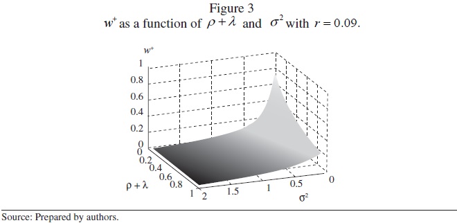 iff 0 < w+ < 1. Figure 3 shows w+ as a function of ρ + λ and σ2 with a constant value of r.
