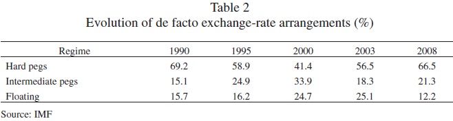 Policymakers now warn against the use of a fixed rate of devaluation or an adjustable band in countries open to capital flows. This belief that intermediate regimes between fixed exchange-rate and free floating are unsustainable is known as the bipolar view (see, for instance, Fischer, 2001). The proportion of IMF members with intermediate arrangements fell during the 1990s, while the use of hard pegs and more flexible arrangements grow. Also, Table 2 shows the evolution of de facto exchange -rate arrangements.