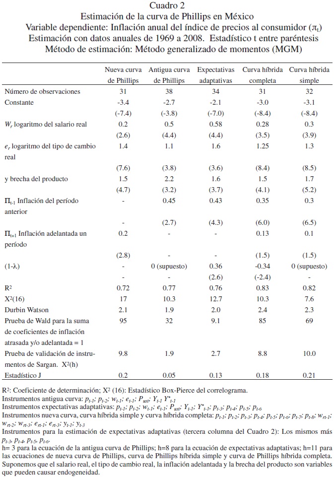 • La antigua curva de Phillips y la versión con expectativas adaptativas muestran una estimación más parsimoniosa que las otras versiones. Son estimaciones más robustas por dos razones: una porque requieren pocos instrumentos para ofrecer resultados satisfactorios; la otra porque aunque se amplíe el número de instrumentos siguen mostrando resultados similares (esto no se muestra en el Cuadro 2).