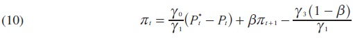 La ecuación (7) es la curva de Phillips para la economía, en la cual la inflación presente depende positivamente del indicador del costo marginal real (Pt*-Pt), de la inflación de referencia del período t (πt*), del valor esperado de la inflación futura (Etπt+1) y de la diferencia- si la hay- entre este valor esperado y la inflación de referencia del futuro (πt+1*). En la mayor parte de los casos (β<1), la inflación depende negativamente de la preocupación de los empresarios por aumentar precios por arriba de la inflación de referencia (γ3(1-β)).