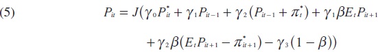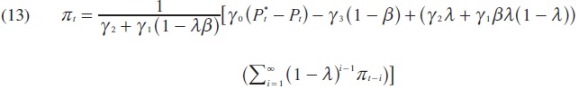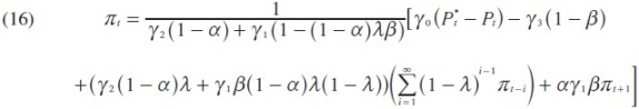 (16) es una curva de Phillips híbrida, donde la inflación actual depende del indicador de costo marginal real (Pt*-Pt), de la inflación futura y de los rezagos de inflación que decaen en forma geométrica.