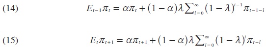 Una versión restringida de (22) es una en la cual se supone a prior λ=1, con lo cual queda un modelo híbrido donde la inflación atrasada un período y adelantada un período entran en la ecuación. Este tipo de modelo híbrido ha sido estimado por Galí y Gertler (1999) y, para México, por Ramos Francia y Torres (2008). La ecuación correspondiente a este modelo sería: