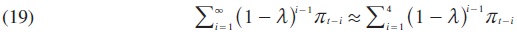 Para el caso de expectativas adaptativas hay una fuerte limitación de información, de modo que el término de sumatoria infinita de inflación de las ecuaciones (13) y (16) se sustituye por una aproximación con cuatro rezagos. Así:
