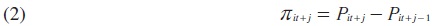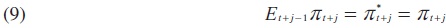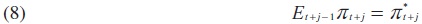 Donde CT¡ es el costo total que enfrenta la empresa i. Pit+j es el logaritmo del precio que fija la empresa i en el período t+j; Pit+j* es el logaritmo del precio que fijaría la empresa i si no hubiera relaciones clientelares. πit+j es el cambio porcentual de precio de la empresa i en el período t+j; π* es una inflación general de referencia (core inflation). EtXt+j es el valor esperado en el período t de las variables X en cuestión. El parámetro p es un factor de descuento entre cero y uno. Los costos futuros de la empresa le importan al empresario pero, en general, menos que los costos contemporáneos.
