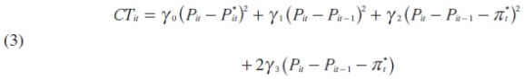 El otro costo de reputación (γ2(πit- π*)2+2γ3(πit- π*)) es el de incrementar precios por arriba de una inflación de referencia (π*), la cual puede ser, por ejemplo, la inflación esperada general. En este caso hay que agregar un componente lineal que indica que cuando la empresa incrementa precios por debajo de la inflación de referencia, el costo total disminuye. Para que esto suceda y3 tiene que ser suficientemente grande, de modo que, en el dominio relevante para la inflación, cambios en los cuales el incremento de precios de la empresa está por debajo de la inflación de referencia propician una reducción del costo total de reputación para la empresa.