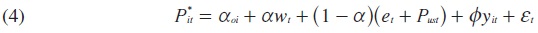 Donde w es el logaritmo del salario nominal; e es el logaritmo del tipo de cambio nominal; Pus es el logaritmo del precio de los bienes importados en moneda extranjera; yi es el exceso de demanda que enfrenta la empresa i; a0 es una constante; ε es un error aleatorio distribuido normalmente con media cero y varianza constante, el cual indica que la productividad y/o el margen sobre los costos son aleatorios.
