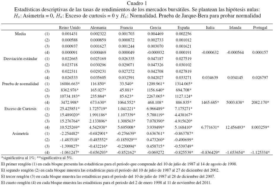 Continuando con el análisis exploratorio de los datos, el Cuadro 1 presenta algunas estadísticas básicas de las tasas de rendimiento. Al parecer, las tasas de rendimiento de los ocho países poseen características similares. Todas las series, excepto Grecia, muestran una asimetría negativa, lo que implica una falta de simetría. Todas las series tienen curtosis positiva y son leptocúrticas y, por lo tanto, ninguna serie sigue una distribución normal tal y como lo indica la prueba de Jarque-Bera. Obsérvese también que la tasa de rendimientos de Grecia presenta la mayor varianza, mientras que la tasa del Reino Unido es la de menor varianza.