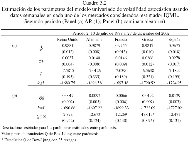 El modelo univariado de volatilidad estocástica se estimó mediante el método IQML para cada uno de los índices de los ocho mercados de valores en consideración. Es importante recordar que el método de estimación considera la transformación (3) que, además de eliminar las tasas de rendimiento con valores iguales a cero, también corrige el exceso de curtosis y asimetría de εt*, proporcionando así estimadores más eficientes que los estimadores QML. Los Cuadros 3.1 a 3.4, panel (a), (3.2, 3.3) presentan las estimaciones IQML de los parámetros Φ, ση2, y γ en el modelo univariado de volatilidad estocástica para cada uno de los periodos considerados. Los valores de Φ cercanos a uno indican una considerable persistencia en la volatilidad logarítmica. En los primeros tres periodos, Grecia y España son los mercados con mayor persistencia y los más volátiles, mientras que el mercado con menor volatilidad logarítmica es el del Reino Unido. Para el cuarto periodo, donde ya se incluyen los mercados de Irlanda, Italia y Portugal, Grecia sigue siendo el mercado con la volatilidad más persistente y Reino Unido el menos volátil. Debido a la gran persistencia que presentan los ocho mercados en cuestión, en los Cuadros 3.1 a 3.4, panel (b) se presentan las estimaciones bajo la especificación de una caminata aleatoria. Como puede observarse por medio del logaritmo de la verosimilitud, el ajuste bajo las dos especificaciones es prácticamente igual. Las desviaciones estándar asintóticas de los parámetros estimados se reportan en paréntesis. También se reporta el estadístico de Box-Ljung junto con su valor p entre paréntesis, el cual indica que no existe correlación en los residuales.