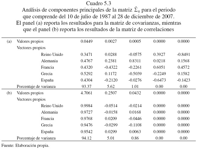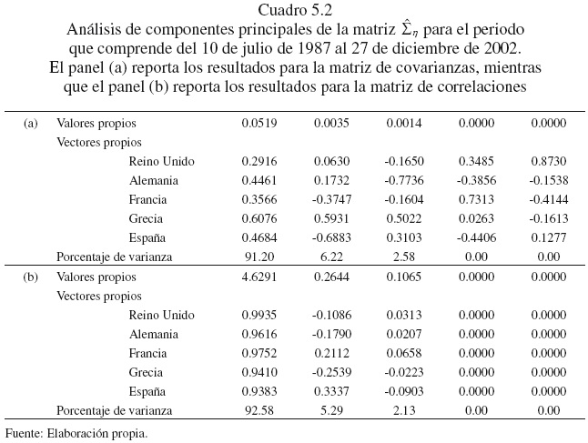 El Cuadro 5.2 muestra los resultados del análisis en el segundo periodo; como puede observarse, las primeras dos componentes principales, tanto para la matriz de covarianzas como para la de correlaciones, en cada caso acumula el 97.4% y el 97.8% de la varianza de la variable de perturbación ηit para cada uno de los cinco mercados considerados. Igual que en el primer periodo, también se observa que la segunda componente es relativamente más importante cuando la matriz de covarianzas es analizada.