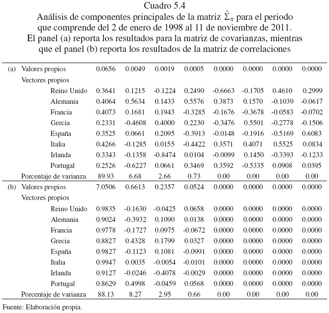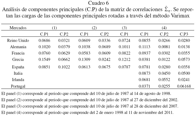 Finalmente, para el cuarto periodo, en donde ya se incluyen los mercados de Italia, Irlanda y Portugal, las tres primeras componentes principales, tanto para el análisis con la matriz de covarianzas como con la matriz de correlaciones, acumulan el 99% de la varianza de la variable de perturbación ηit para cada uno de los ocho mercados considerados. A diferencia del primero y segundo periodos, se observa que la segunda y tercera componentes son relativamente más importantes cuando la matriz de correlaciones es analizada.