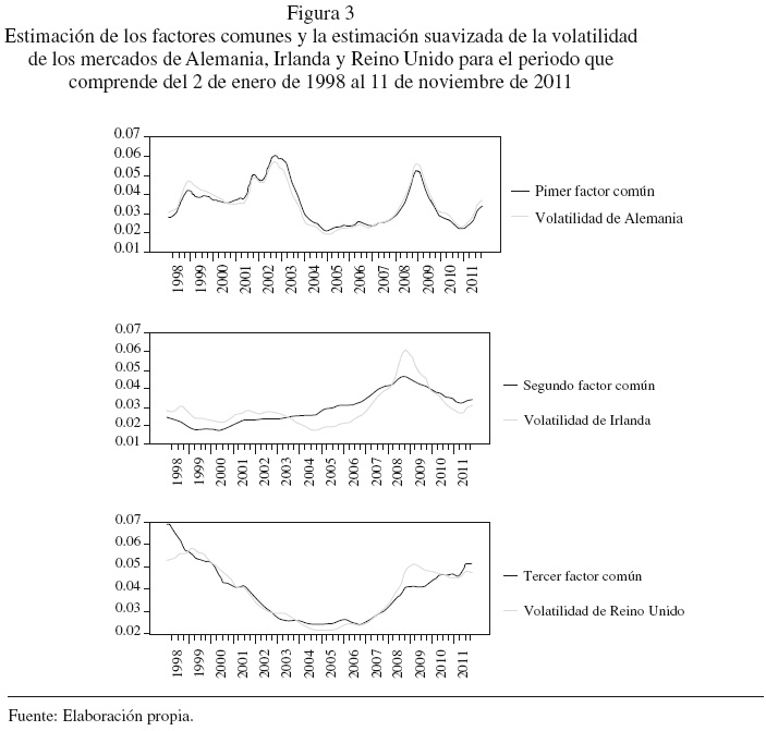 A manera de ilustrar la sincronización de cada factor común con las volatilidades de los mercados bursátiles con las que se asocia, para el cuarto periodo, la figura 3 muestra la estimación de la volatilidad de Alemania, Irlanda y Grecia junto con sus factores asociados. Como puede observarse, el movimiento de la volatilidad se ajusta muy bien al del factor que resultó explicarla.8