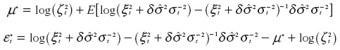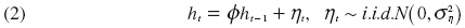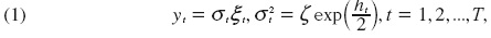 Aquí, ζ es una constante y se supone que los procesos ξt y ηt son independientes. Si el parámetro autorregresivo Φ, toma valores en el intervalo (-1,1), entonces (2) se vuelve un proceso estacionario. Si ξt y ηt son ruidos blancos Gaussianos independientes con varianzas 1 y ση2 respectivamente, el sistema (1)-(2) se denomina modelo de volatilidad estocástica log-normal. Una interpretación de la volatilidad logarítmica en el momento t, ht, es que representa el flujo aleatorio de nueva información. El parámetro ζ desempeña el papel de un factor de escala constante y se puede concebir como la volatilidad instantánea modal; Φ es la persistencia de la volatilidad y ση2 representa la expresión logarítmica de la volatilidad. Algunos enfoques para la estimación del modelo de volatilidad estocástica son: 1) la cuasimáxima verosimilitud (QML) sugerida por Nelson (1988) y por Harvey, Ruiz y Shephard (1994); 2) el enfoque Bayesiano jerárquico propuesto por Jacquier, Polson y Rossi (1994) y 3) el enfoque de cuasi-máxima verosimilitud mejorada (IQML) propuesto por Breidt y Carriquiry (1996).