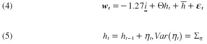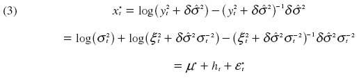 donde wt, y εt, son vectores de orden mx1 con componentes yit2 y εit = logξit2 + 1.27, i = 1, 2,...,m, respectivamente, y