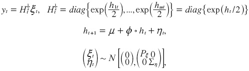 donde ht = (h1t,..., hmt)' es un vector de volatilidad logarítmica no observable de orden mx1, μ y Φ son vectores de parámetros de orden mx1, el operador ° denota el producto de Hadamard, Σn = {σn,ij} es una matriz positiva definida y Pξ = {ρij} es la matriz de correlaciones con ρij = 1 y |ρij| < 1 para cualquier i ≠ j, i, j = 1,2,..., m.