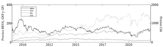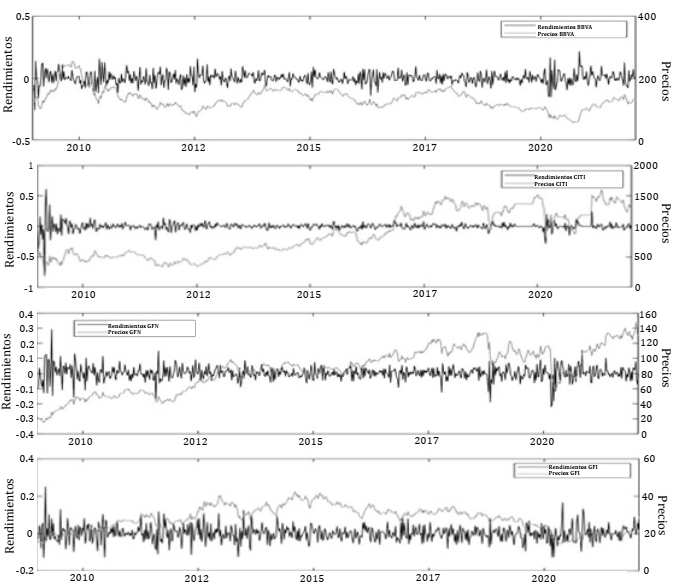 Para la estimación de la correlación dinámica entre las volatilidades de los cuatro bancos estipulados: BBVA, City-Banamex, Banorte e Inbursa; se utilizan los datos de los precios accionarios semanales de cierre, siendo el periodo bajo análisis del 27 de enero de 2009 al 29 de octubre de 2021. La Gráfica 1 muestra los precios accionarios de los bancos y la Gráfica 2 exhibe tanto los rendimientos de los precios accionarios, así como los respectivos precios accionarios de los bancos bajo análisis.