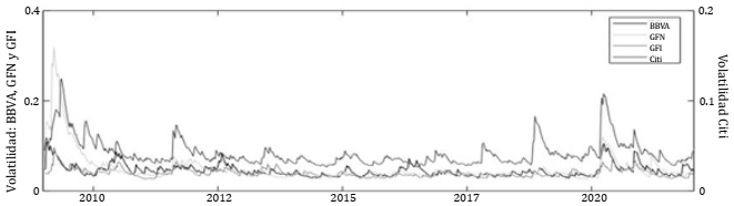 La Gráfica 3 muestra las volatilidades condicionales obtenidas a través del proceso AR(1) GARCH (1,1) univariado para cada uno de los bancos.