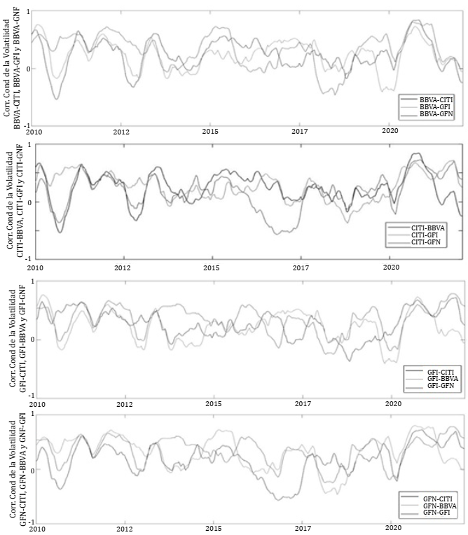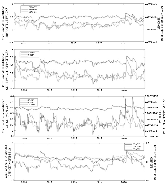 Gráfica 4 Correlación Condicional de la Volatilidad obtenida del proceso DCC-AR(1)-GARCH(1,1), para cada uno de los bancos: BBVA, Citi-Banamex, Banorte e Inbursa.