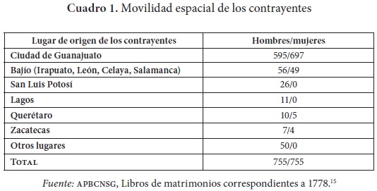 Esta descripción revela el pensamiento del grupo privilegiado, formado por españoles, hacia los demás habitantes, las castas e indios, a los cuales veían como inferiores por pertenecer a una calidad diferente. Se puede notar el rechazo del grupo hegemónico hacia los otros grupos, ya que consideraban que los individuos de calidades inferiores y de clase baja como los mulatos, los mestizos y los moriscos eran portadores de los peores vicios y pecados. De la descripción de Guanajuato como “abrigo de gentes”, “refugio de muchos pobres a quien recibe con entrañas de plata”, “madriguera de hombres viciosos” se desprende que su población era flotante, dadas las condiciones de las actividades mineras, pues los individuos iban y venían diariamente o por temporadas a este lugar para laborar en las minas. La población estaba compuesta por habitantes permanentes y por habitantes temporales que eran oriundos de lugares diversos, tal como lo muestran los datos contenidos en el cuadro 1, acerca del origen de los contrayentes de los matrimonios celebrados en 1778.