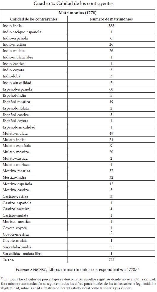Con los registros matrimoniales de 1778 se pudo calcular el grado de mestizaje que se dio en la población, incluso se constató que ya para ese año no estaban en uso algunas denominaciones de castas como negro o negra, y en ningún caso se anotaron las calidades peyorativas de “tente en el aire”, “salta patrás”, etc. En los datos sobre el mestizaje pueden reconocerse rasgos muy claros de la endogamia dentro de los grupos de españoles y de los indígenas, así como la exogamia practicada principalmente por las castas de mestizos, mulatos, castizos y coyotes. La diferencia pudo obedecer a que tanto españoles como indios buscaban perpetuar su prestigio y linaje, mientras que para las castas el mercado matrimonial era más abierto por la convivencia en diferentes espacios públicos, es decir, que, a pesar de las limitaciones e imposiciones segregacionistas, estos últimos lograron una mayor libertad para transgredirlas.