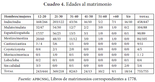 En el cuadro 4 se pueden advertir las tendencias de edad para contraer nupcias. La tabla está dividida en grupos de 10 en 10 por edades de hombres y mujeres para facilitar la observación de la información contenida.