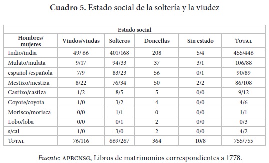 La condición social de la soltería o la viudez era muy importante también en la feria matrimonial. Los hombres tenían preferencia por las mujeres solteras, como se muestra en el cuadro 5, en el que se observan los índices de la soltería en los hombres y mujeres. Cabe resaltar que para la época que estamos tratando se distinguía entre las mujeres doncellas y las mujeres solteras, respecto a lo que menciona Gonzalbo, la distinción era en atención a las apariencias de respetabilidad más que a una presunta virginidad de las doncellas.[44] Dada la importancia de dicha distinción en las mujeres, en el cuadro se agrega una columna para cada una. Asimismo se detallan los datos sobre la viudez.